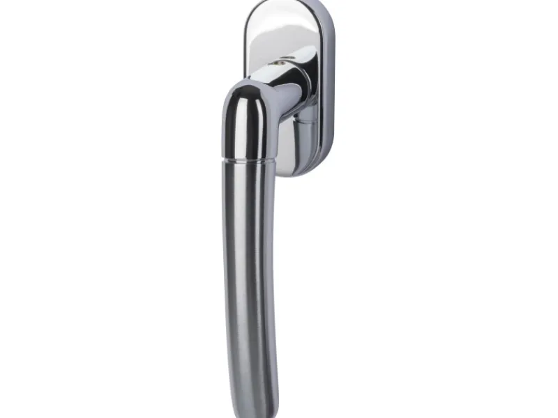 Fenstergriff „Betty“ in Chrom Poliert-Satiniert mit stabiler Metallunterkonstruktion und Verbundrosette. Der Griff verfügt über eine 90° Rasterung und einen 7 mm Vollstift. Die Fensteroliven sind universell einsetzbar.