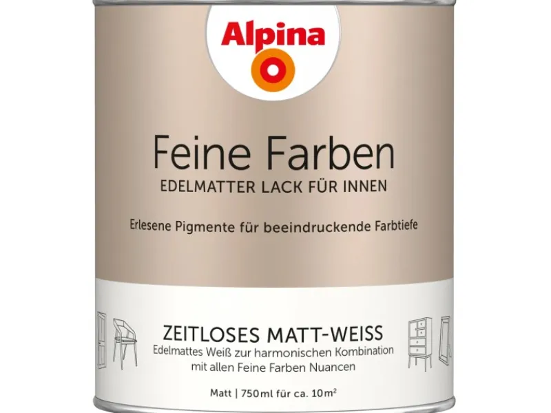 Alpina Feine Farben Lack – edelmatte Buntlacke mit Persönlichkeit für Möbel mit Charakter. Jede einzelne dieser zeitlos-klassischen Nuancen besitzt eine einzigartige Inspirationsgeschichte. In harmonischer Kombination mit den Feine Farben Wandfarben schaffen sie ein edles, vollendetes Raumgefühl. Erlesene Pigmente sorgen für eine beeindruckende Farbtiefe und sehr gute Farbbeständigkeit. Die besonders deckende und hochergiebige Lackqualität überzeugt durch ein perfektes Lackierergebnis sowie eine gleichmäßige, edelmatte und strapazierfähige Oberfläche.
