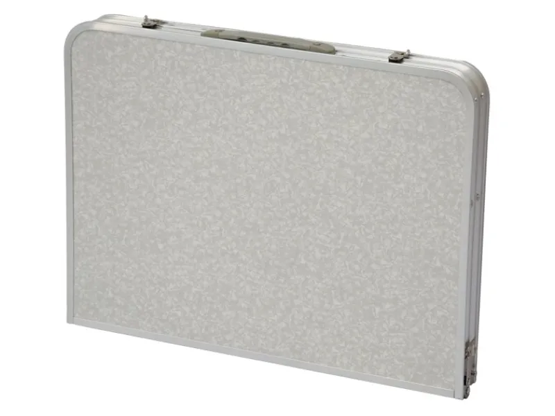 Rahmen & Gestell des Klapptisches aus Aluminium, die Tischplatte mit Kunststoff beschichtetem MDF.