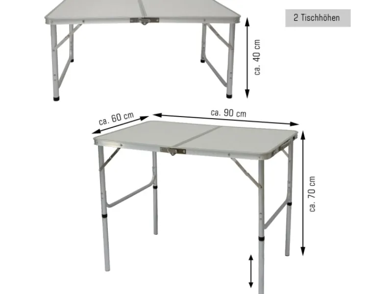 Tisch aufgebaut LxBxH ca. 90x60x40-70 cm – zusammengeklappt LxBxH ca. 60x46x6 cm