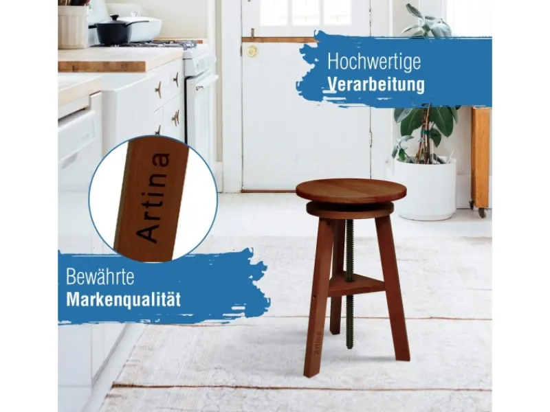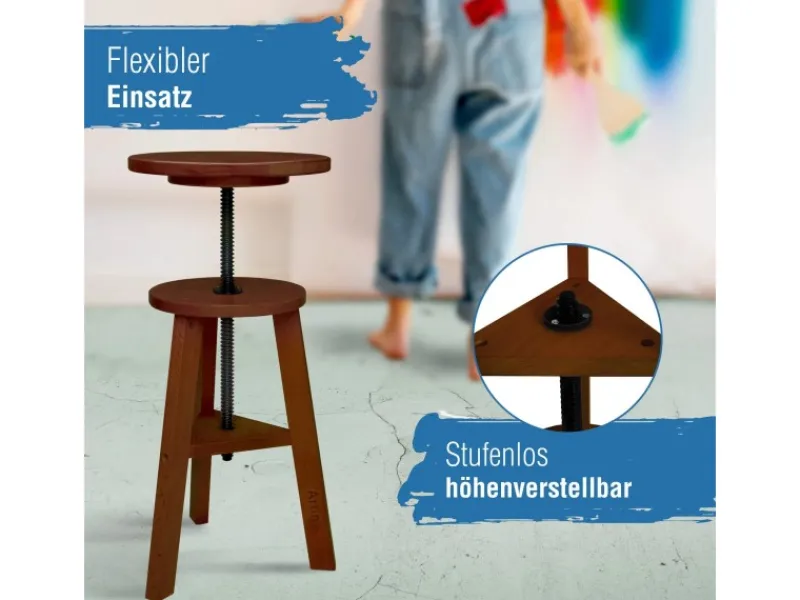 Höhenverstellbarer Malhocker aus massivem Buchenholz – Sitzhöhe einstellbar Nutzen Sie diesen höhenverstellbaren und aus massivem und geöltem Buchenholz gefertigten Malhocker, um auch über einen längeren Zeitraum entspannt kreativ arbeiten zu können. Der Drehhocker sorgt beim Sitzen für einen geraden Rücken. Passen Sie den Küchenhocker bequem auf die gewünschte Höhe an, so fördern Sie gleichzeitig ein aufrechtes Sitzen. Der hohe Hocker ist ein wahrer Allrounder: Ob im Atelier, Büro, Werkstatt oder in der Küche. Mit der massiven Verarbeitung aus Buchenholz und Stahlschrauben ist der Stuhl Hocker besonders robust und kann vielfältig eingesetzt werden. Stufenlose Höhenverstellung Die Sitzfläche des Hockers beträgt ca. 30 cm und die stufenlose Höhenverstellung erfolgt über eine massive Metallspindel. Der Hocker aus Buche wird als Bausatz geliefert und ist binnen weniger Minuten und Handgriffe einsatzbereit. Sie erhalten zusätzlich eine leicht verständliche Aufbauanleitung und einen Montageschlüssel. Produktdetails: Marke: Artina Material: massives, geöltes Buchenholz Maße Sitzfläche: ca. 25 cm Sitzhöhe: stufenlos verstellbar (min: 42 cm, max: 60 cm) Abstand Beine: außen ca. 29 cm / innen ca. 22 cm