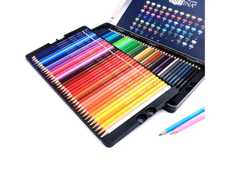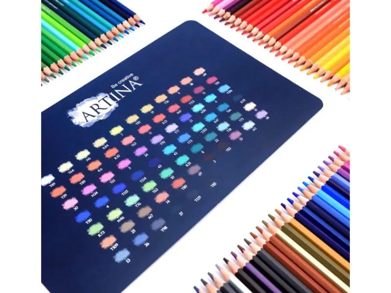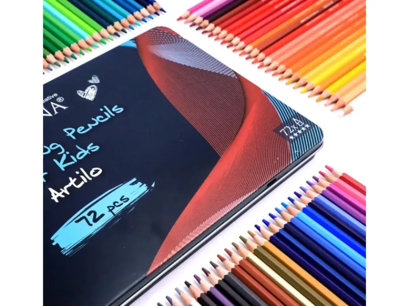 Produktdetails:Marke: Artina Serie: Artilo Set: 48/ 72/ 120 Stk Mine: 3,3 mm, vorgespitzt Aufbewahrung: Metallbox Farbbrillianz: prächtig, hoch pigmentiert, ausdrucksstark Verwendung: Malen, Mischen, Hervorheben, Schattieren, Schreiben, Skizzieren, Ausmalen und Zeichnen
