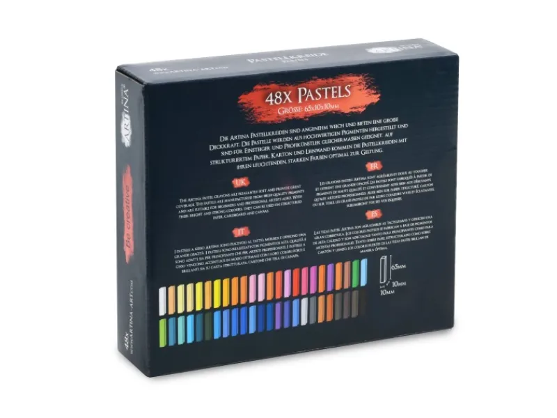 Artina WeichpastellkreideWerden Sie kreativ, erweitern Sie Ihren Künstlerbedarf und entdecken Sie die vielfältigen Möglichkeiten mit der Artina Softpastellkreide im Set. Als eines der Top-Produkte dieser Reihe lassen sich die Softpastelle ohne Zuhilfenahme anderer Malmittel sehr bequem verarbeiten. Mit den weichen und seidenmatten Farben lassen sich wundervolle Farbverläufe mit verblüffender Wirkung schaffen. Die Pastellpigmente von Artina überzeugen durch eine sehr hohe Farbintensivität sowie durch eine äußerst brillante Farbgebung und können für viele Maltechniken innerhalb der Pastellmalerei angewendet werden.Feinste Pigmente und kräftige FarbenDurch die hohe Stabilität der Mischung aus anorganischen und organischen Mineralien in den Pigmenten, entsteht eine besonders vielfältige und kräftige Farbwirkung mit hoher Leuchtkraft.Die Pastelle besitzen einen mäßigen Härtegrad und eine filigrane Färbung.Die Artina Softpastelle als Kreide Stifte sind weich und zeichnen sich durch eine hohe Farbintensität sowie einen samtigen Abrieb aus, welcher sich gut verwischen lassen.Maße einer Softpastellkreide:Länge: ca. 62mm Breite: ca. 10mmProduktinformationverschiedene Farben sehr farbintensiv hohe Leuchtkraft Länge: ca. 62 mm Durchmesser: ca. 10 mm