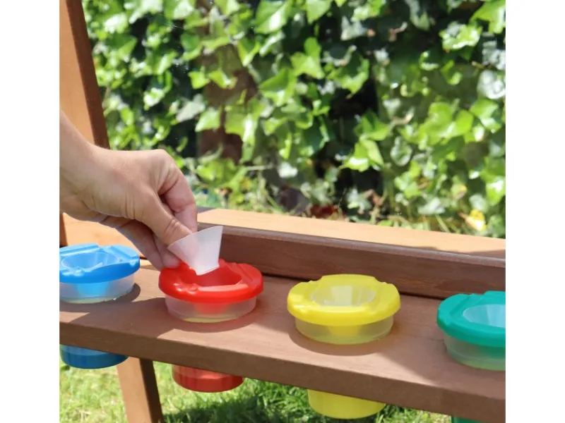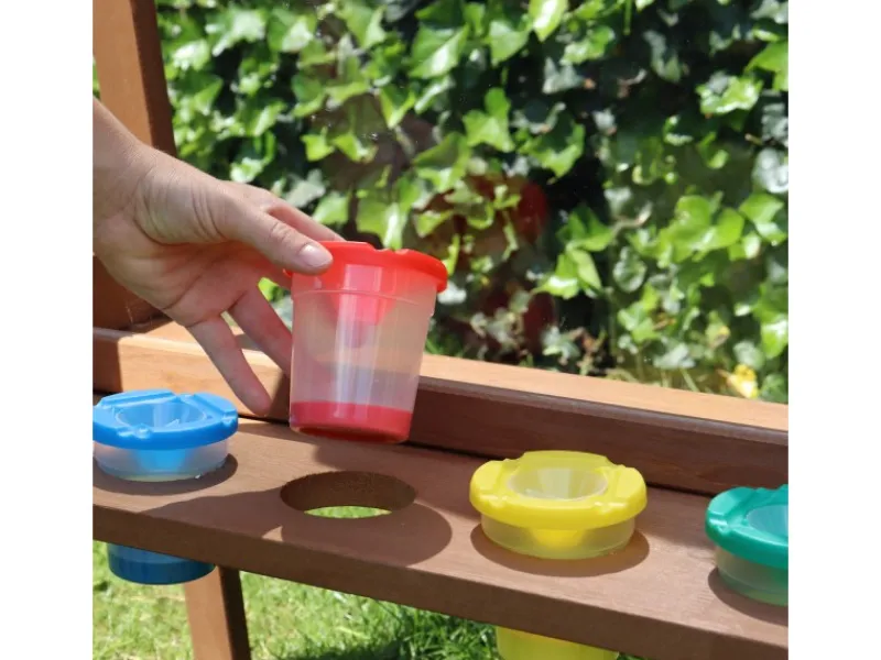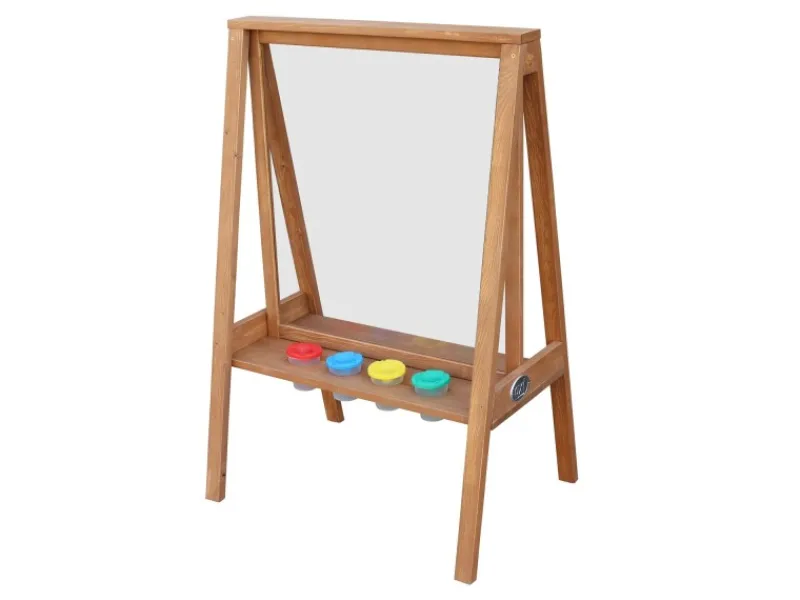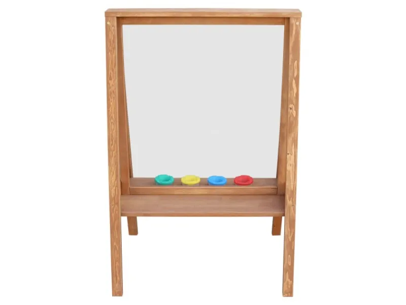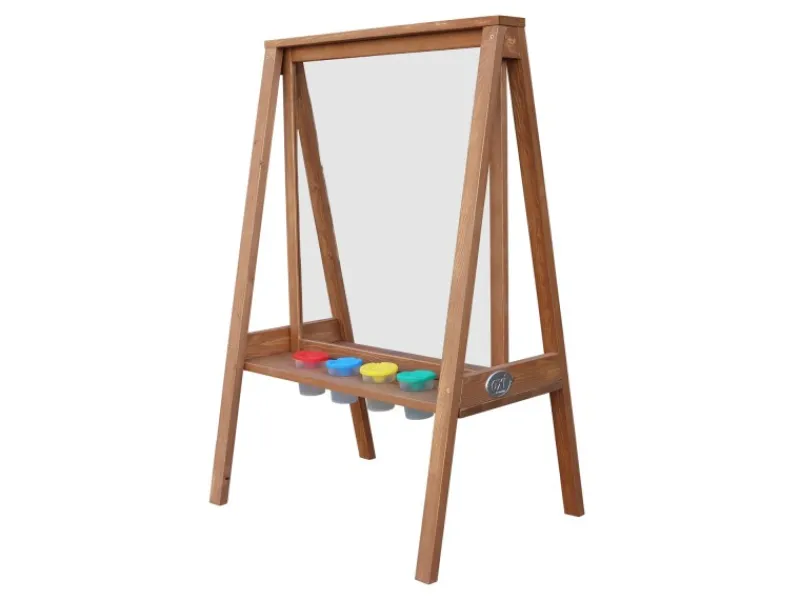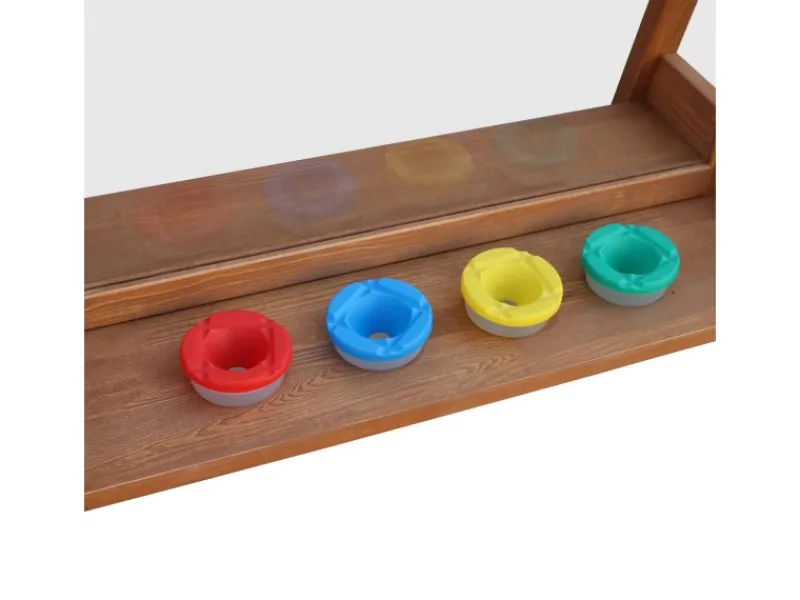 Die Staffelei verfügt über eine leicht zu reinigende Plexiglas-Leinwand, die es ermöglicht, dass Kinder an beiden Seiten gleichzeitig spielen können. Zudem bietet die Staffelei vier farbige Fächer und eine Ablagefläche für alle Zeichenutensilien, damit alles sauber und ordentlich bleibt.