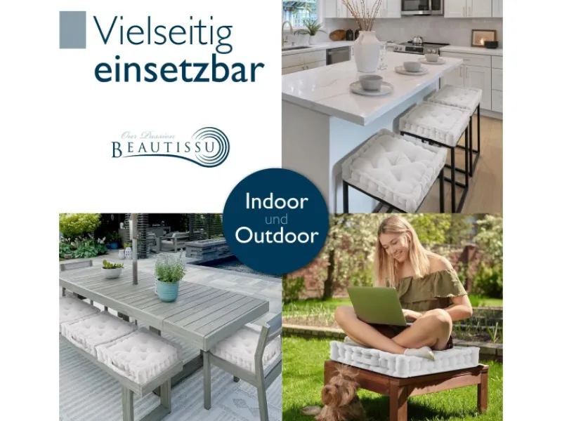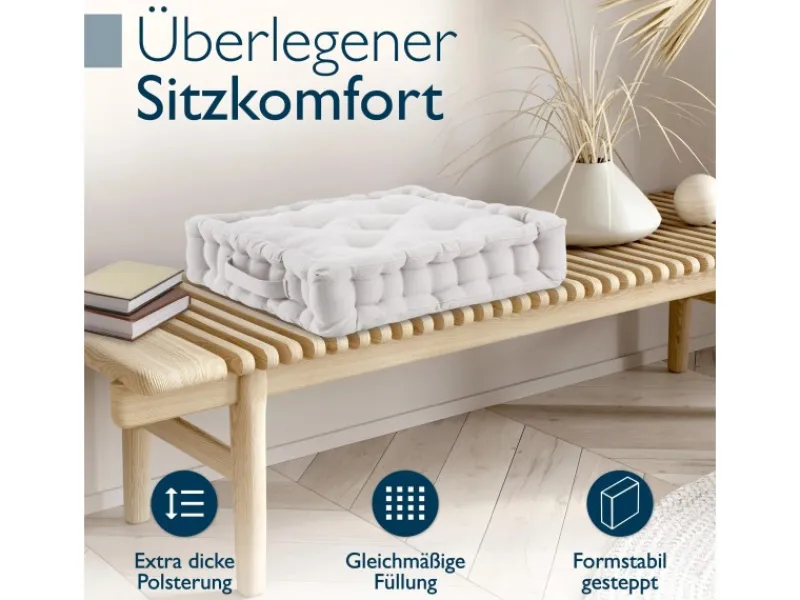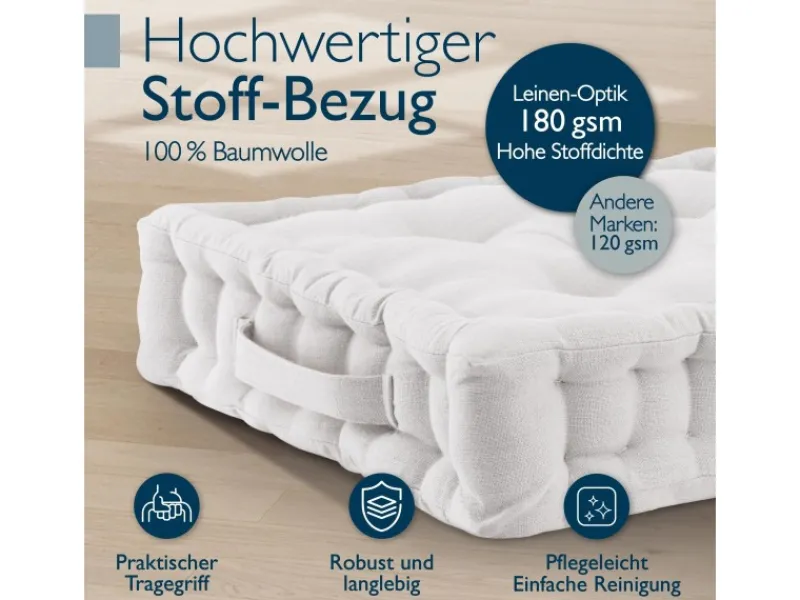 Die besonders bequemen Stuhlkissen Mila von Beautissu haben eine Größe von ca. 50×50 cm und sind 8 cm dick.Unsere Matratzenkissen überzeugen mit einem Bezug und einer Füllung aus reiner Baumwolle. Sie bieten nicht nur optimalen Komfort, sondern sind auch besonders hautfreundlich.Ob als bequemes Stuhlkissen, weiches Bodenkissen, Matratzenkissen, Rückenkissen oder einfach nur als stylisches Wohnaccessoire, diese Kissen sind in jedem Fall die perfekte Wahl.Die Bodenkissen Mila bieten exzellenten Komfort und Stil. Jedes Kissen besteht zu 100% aus hochwertiger Baumwolle und sorgt für eine angenehme Sitz- oder Liegefläche.Dank des praktischen Tragegriffs ist unser Bodenkissen einfach zu transportieren und ideal für den flexiblen Einsatz – ob im Wohnzimmer, auf der Terrasse oder bei Outdoor-Aktivitäten.