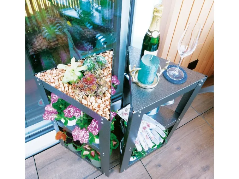 Ob klein oder hoch, ob eng oder weit – Triangolo passt sich an veränderte Platzverhältnisse an. Das Pflanzregal lässt sich dank einfachem Stecksystem mit einem weiteren Regal bis zu einer Höhe von 140 cm erweitern. Die Böden des Pflanzregals können Sie beidseitig einsetzen und wahlweise eine vertiefte Fläche oder eine flache Oberfläche nutzen. So können Sie das Regal beispielsweise auch als kleinen Steingarten anlegen und mit Sukkulenten bepflanzen.