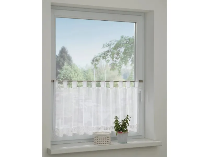 Die Bistrogardine Naturoptik mit Häkelspitze überzeugt mit ihrem natürlichen Aussehen und dem klassischen Dessin. Der transparente Stoff umschmeichelt sanft das Fenster und deckt ab ohne zu verdunkeln oder die Sicht vollständig zu nehmen.