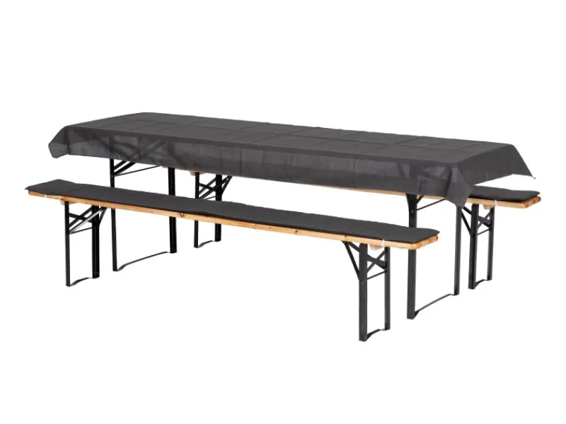 Das Beo Auflagen-Set für Festzeltgarnituren umfasst eine Tischdecke und zwei Bankauflagen. Die Bezüge und die Tischdecke bestehen aus einem Materialmix aus 50 % Polyester und 50 % Baumwolle, während die Bankauflagen eine 2 cm dicke Füllung und einen Gummizug zur sicheren Befestigung an der Bank besitzen.