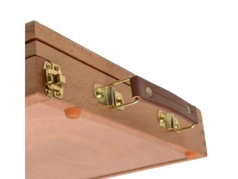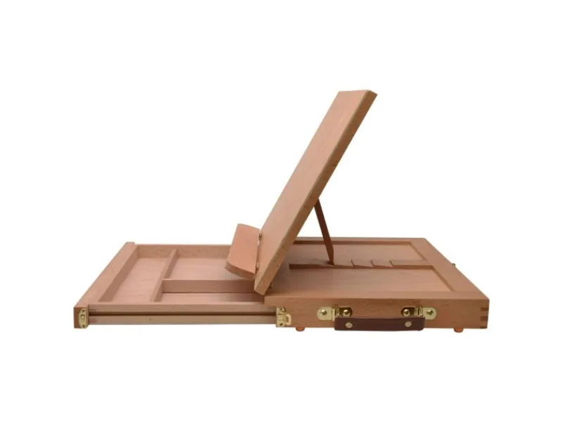 Artina Calais – Stabiler Malkoffer, Zeichenbrett, Tischstaffelei aus BucheDer Malkoffer Calais ist aus Buchenholz gefertigt und besitzt eine Holzmischpalette und ein Aufbewahrungsfach für Ihre Malutensilien.Verstellbarer NeigungswinkelBei dieser hochwertigen Tischstaffelei kann die Arbeitsfläche in fünf Stufen um 90° nach hinten geneigt werden und so der Neigungswinkel individuell angepasst werden.