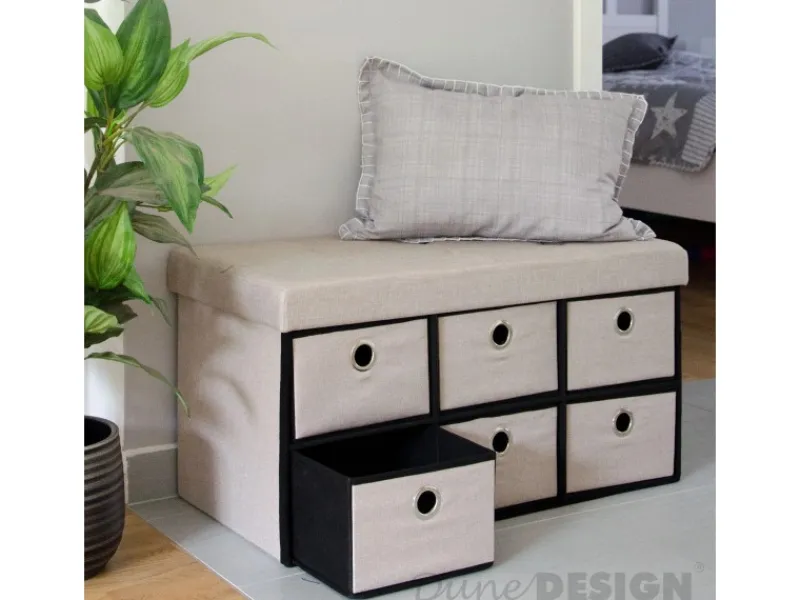 Der 2-Sitzer faltbare Bank mit Schubladen von DuneDesign ist mehr als eine Bank! Das schöne Möbelstück besticht nicht nur durch seine moderne, edle Leinen-Optik, die zu jedem Einrichtungsstil passt, sondern auch durch seine Doppel-Funktionalität. Die faltbare Truhe kann als bequeme Sitzgelegenheit für mehrere Personen, Fußablage, als kleiner Beistell- oder Nachtisch und natürlich als stauraumreiche Aufbewahrungskiste verwendet werden. Im Schlafzimmer vor dem Bett als Bettkommode, im Wohnzimmer vor der Couch als Fußhocker oder im Esszimmer als zusätzliche, attraktive Sitzgelegenheit für Ihr Besuch, im Kinderzimmer als große Spielzeugbox, im Flur oder Diele als Schuhbank – die vielseitige Klapptruhe findet überall ihren Platz.