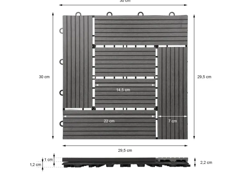 Lieferumfang: 1 m² WPC-Fliesen Anthrazit Mosaik Technische Daten: Material: WPC (Holz-Kunststoff-Verbundwerkstoff) Unterkonstruktion: Drainageboden aus Polypropylen Farbe: Anthrazit Maße (L x B): ca. 30 x 30 cm (pro m² sind 11 Fliesen notwendig) Höhe: ca. 2,2 cm Gewicht je Fliese: 850 g Verlegeart: Stecksystem (Klicksystem) Eigenschaften: Moderne und edle Optik Träger mit Drainage für Wasserablauf – rutschfest Splittert und reißt nicht Witterungsbeständig, UV-beständig, frostsicher und langlebig Klicksystem – spielend leicht zu verlegen Bei Umzug leicht zu demontieren Geeignet im Innen- und Außenbereich Aus Holzfaser (50 %) und Polymerfaser (höhere Steifigkeit im Gegensatz zu Vollholz) individuell anpassbar Beschreibung: Diese Terrassenfliese mit intelligentem Stecksystem ist eine stilvolle und praktische Lösung für den Balkon, die Terrasse , den Garten, ins Badezimmer und in den Sauna- und Poolbereich.Die Terrassenfliesen bestehen aus hochwertigem WPC-Material und sind daher sehr wetterbeständig. Außerdem sind sie rutschfest, splittern und reißen nicht. Die Terrassenfliesen sind pflegeleicht und verleihen Ihrer Terrasse ein sauberes und gepflegtes Aussehen. Das WPC ist ein thermoplastischer Verbundwerkstoff und setzt sich zusammen aus Holz, Kunststoff und Additiven. Die Kombination dieser Materialien ermöglicht eine hohe Beständigkeit und die optischen Eigenschaften eines Naturproduktes.