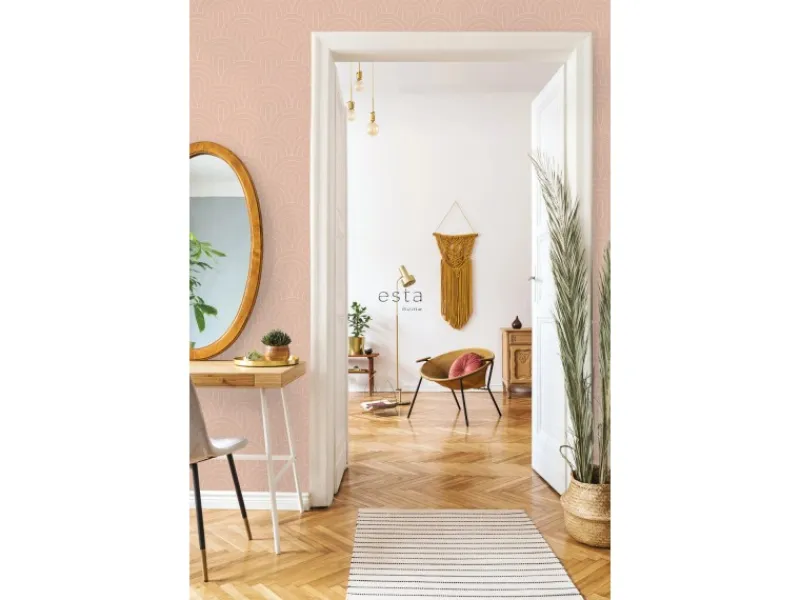 Diese schöne Tapete mit Art Decó Muster in Pfirsichrosa verleiht jedem Wohnraum einen frischen Look. Diese Tapete kann mit vielen Stilen und Farben kombiniert werden und das macht diese Tapete zu einem absoluten Must-Have. Maße, Rapport und Musterversatz Die Maße dieser Tapete sind 53 cm x 10. 05 m (Breite x Länge). Der Rapport ist 26. 5 (gerader Ansatz). Das heißt, dass das Motiv sich alle 26. 5 cm wiederholt und das Muster der einzelnen Tapetenbahnen auf gleicher Höhe geklebt werden muss.Tapezieren Das Anbringen dieser Vliestapete ist einfach und unkompliziert: nachdem der Vlies-Kleister direkt auf die Wand aufgebracht wurde, kann die Tapete angesetzt und anschließend glattgestrichen werden. Eventuelle Überstande können mit einem Cuttermesser entfernt werden. Beim Tapezieren wird kein Tapeziertisch benötigt und die Tapete ist auch nach Jahren restlos trocken abziehbar. Für das beste Tapezierergebnis empfiehlt ESTAhome den professionellen Wallpro PRO-301 Tapetenkleister. Vorbereitungstipp: Verhindere Probleme mit der Haftung deines Tapeten, indem du vorher testest, ob deine Wandoberfläche stark saugend ist. Nimm dazu einen feuchten Schwamm und befeuchte einen kleinen Teil der Wand. Wenn der feuchte Bereich innerhalb weniger Sekunden verschwindet, ist die Wand sehr saugfähig. In diesem Fall empfehlen wir, ein Grundiermittel zu verwenden, um die Saugfähigkeit zu verringern. ESTAhome empfiehlt hierfür die WALL PRO-401 Tapetenprimer.Sofort startklar! Am einfachsten ist es, direkt auch der benötigte Tapetenkleister und ein Wallpro PRO-933 Tapezierset zu bestellen. Dieses Tapezierset enthält alle Tapezierwerkzeuge, die beim Tapezieren von Vliestapeten benötigt werden. Diese Artikel können über das Suchfenster auf der Amazon Seite schnell gefunden und bestellt werden. So wird das Tapezieren zum Kinderspiel!