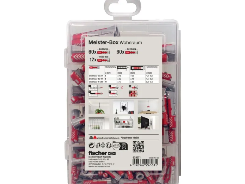 Diese fischer Meister-Box bietet eine praktische und übersichtliche Aufbewahrungslösung als Dübelset für Werkstatt und Baustelle. Der hochwertige, schlagfeste Kunststoffbehälter mit transparentem Deckel ermöglicht jederzeit einen klaren Blick auf den Inhalt. Die vorsortierte 132-teilige Box enthält 120 x DuoPower 6 x 30, 60 x DuoPower 8 x 40 und 30 x DuoPower 10 x 50, optimal für die Befestigung im Wohnraum. Der DuoPower ist ein intelligenter 2-Komponenten-Dübel, der sich automatisch den Gegebenheiten des Baustoffs anpasst. Dank seiner kompakten Bauform reduziert der DuoPower den Bohraufwand, während der schmale Dübelrand das Durchrutschen in das Bohrloch verhindert. Die integrierte Mitdrehsicherung sorgt dafür, dass der Dübel sicher fixiert bleibt und die bestmögliche Rückmeldung gibt einem sofort das Gefühl, wenn der Dübel optimal sitzt. Der DuoPower eignet sich optimal zur Befestigung von leichten und schweren Gegenständen wie Bildern, Lampen, Konsolen, Spiegeln, Wandregalen, Bad- und WC-Einrichtungen sowie Dunstabzugshauben in verschiedenen Baustoffen wie Beton, Volllochziegel, Hochlochziegel, Naturstein, Gipskarton, Gipsbauplatten, Faserplatten, Hohldecken, Bruchsteinwände, Fachwerkbauwände und Spanplatten.