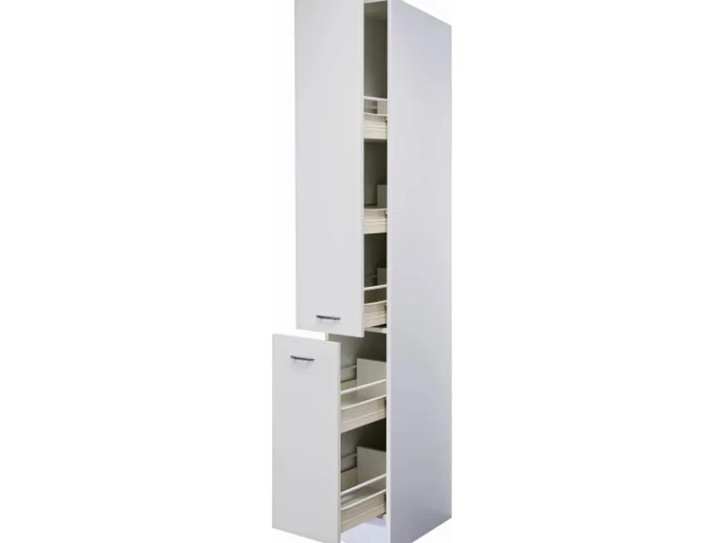 Der Küchenhochschrank bietet mit einer Höhe von 200 cm, einer Breite von 30 cm und einer Tiefe von 57 cm ein Maximum an Verstaumöglichkeiten auf kleinstem Raum. Er verfügt über zwei Auszüge und insgesamt fünf Ablagen und sorgt für Ordnung und Übersichtlichkeit in Ihrer Küche. Hier finden Essig und Öl, Vorratsdosen, Konserven oder Geschirr einen idealen Platz und sind stets griffbereit. Der Apothekerschrank lässt sich optimal mit allen Küchenmöbeln aus der Flex-Well Classic Serie Wito kombinieren.