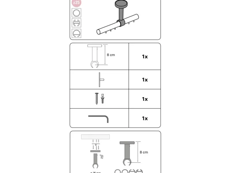 Der Deckenträger ist aus robustem Aluminium gefertigt. Er eignet sich für Dekorationen mit einer Gardinenstange oder Gardinenstange mit Innenlauf. Der Träger besitzt eine Metallmontageplatte. Für eine schnelle und einfache Montage wird das Befestigungsmaterial mitgeliefert.