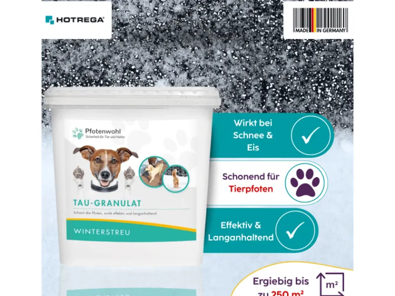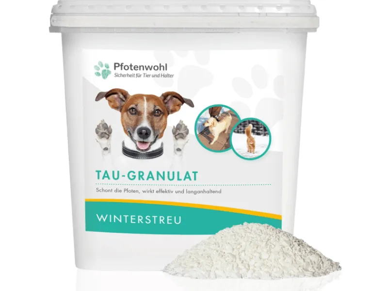 Pfotenwohl Auftaugranulat sorgt für eine zuverlässige Wirkung bei winterlichen Bedingungen. Beim Kontakt mit Schnee oder Eis entwickelt das Granulat kurzfristig Wärme – ähnlich einer leichten „Fußbodenheizung“. Dadurch lösen sich Eisflächen schnell und zuverlässig. Die besondere, schuppenförmige Struktur unterstützt eine gleichmäßige Verteilung und wirkt schonend zu Tierpfoten sowie zu typischen Bodenmaterialien wie Holz, Naturstein, Beton oder Kunststoff.