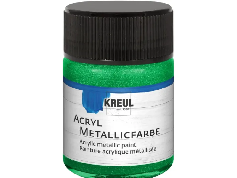 Die Kreul Acryl Metallicfarben schillern bereits im Urzustand und krönen jeden DIY-Auftritt. Kostbares Gold, feurig-funkelndes Kupfer oder Rot – der einzigartige Diamant-Glanz findet sich in den 6 Farbtönen der Metallicfarben und macht jede Deko unbezahlbar. Ihren dramatischsten Auftritt erhält die Farbe, wenn sie großflächig aufgetragen und reizvoll kombiniert wird, z.B. auf hellem Holz oder auf robustem trockener Beton. Die metallischen Farben entfalten ihren Charme, wenn Gegensätze aufeinander treffen.