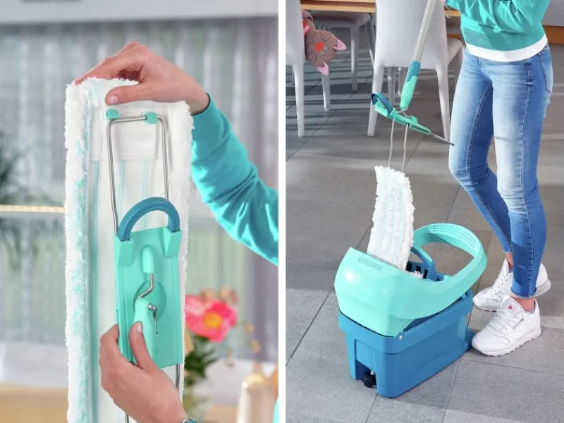 Komfortable Entriegelung der Bodenplatte zum Auswaschen und Auspressen des Wischbezugs mit dem Fuß