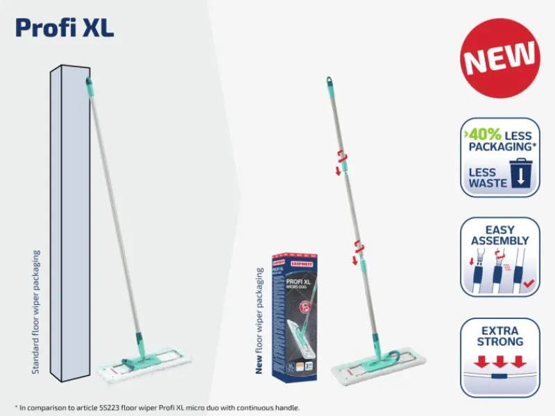 Schluss mit Rückenschmerzen beim Putzen und unschönen Schlieren. Der Leifheit Profi XL micro duo beseitigt mit seinem speziellen 2-Faser-Wischbezug bis zu 99 % der Viren und Bakterien* und lässt sich ganz bequem per Fuß bedienen. So sieht der ideale Bodenwischer für große Flächen, wie Küchen oder auch Büroräume, aus. Der 2-Faser-Wischbezug besteht aus der bewährten Leifheit Microfaser Duo, die sich für die porentiefe Reinigung aller Bodenarten eignet. Reihen von feinsten, leicht erhöhten Borsten reichen bis in kleinste Vertiefungen hinein und entfernen auch hartnäckigen Schmutz ohne Kraftanstrengung. Mit seiner stattlichen Wischbreite von 42 cm spart der Profi micro duo viele Arbeitsschritte und wertvolle Zeit. Das geniale, rundum bewegliche 360 Grad-Drehgelenk ermöglicht ein effektives Reinigen in Schlangenlinien und umkreist geschickt Tisch- und Schrankbeine. Durch den komplett abwinkelbaren Stiel sind auch schwer zugängliche Stellen unter Schränken und Betten leicht zu erreichen. Bedienen lässt sich der Bodenwischer ganz bequem im Stehen: Einfach per Fußklick den Wischüberzug lösen, in der separat erhältlichen Leifheit Wischtuchpresse Profi XL auspressen, Bezug wieder einspannen, fertig.* An modifiziertem Vacciniavirus Ankara und an Staphylococcus aureus Bakterium mit Micro Duo-Bezug und Leifheit Kraftreiniger (25 ml auf 5 l Wasser, Wassertemperatur 60 ?C) getestet.