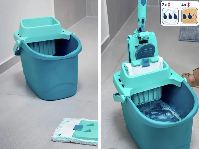 Das kompakte Design sorgt dafür, dass der Eimer nicht nur einfach zu verstauen ist, sondern auch ideal für den Einsatz mit Bodenwischern geeignet.