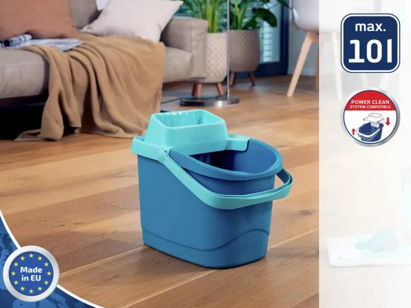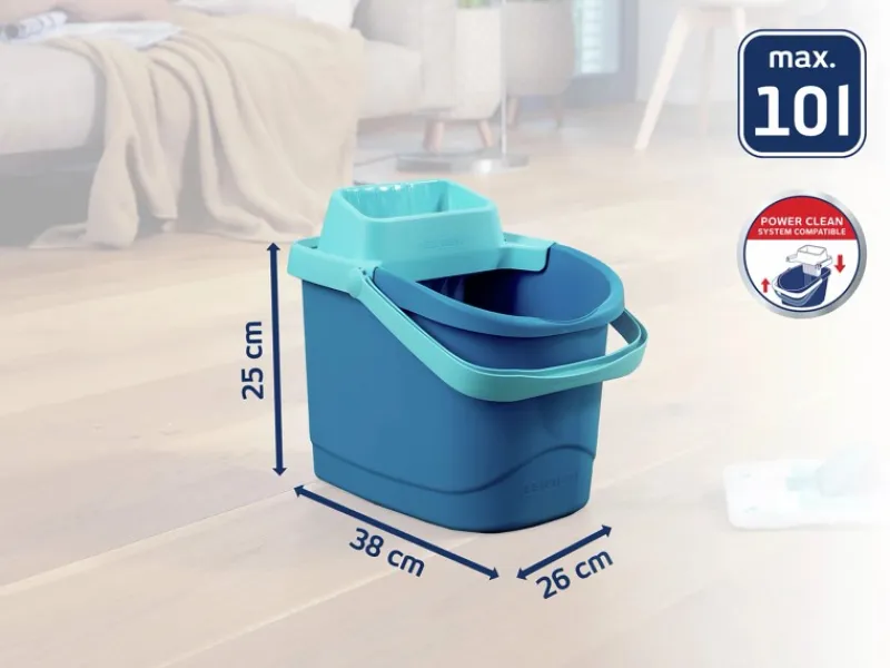 Mit dem separat erhältlichen Pressaufsatz Power Clean und Bodenwischer Power Clean wird der Putzeimer ganz leicht zum vollständigen Wischsystem. Selbst mit angebrachtem Auspresssieb bietet der Eimer noch Platz für 6 Liter Wasser, das sich dank der praktischen Ausgussöffnung nach der Reinigung ganz einfach und ohne Kleckern entleeren lässt.