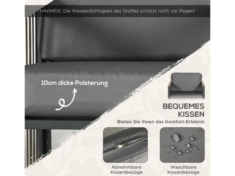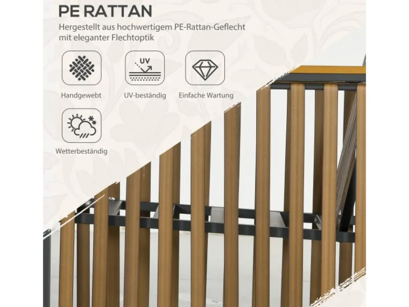 Dieses 3-teilige Rattan-Gartenmöbelset von Outsunny ist ein dekoratives Highlight! Der Metallrahmen, umhüllt von hochwertigem PE-Rattan, gewährleistet eine dauerhafte Haltbarkeit. Mit 10 cm dicken Sitzkissen für zusätzlichen Komfort, Holzdekor an den Armlehnen der Stühle und am Couchtisch für eine geschmackvoll natürliche Note. Das Outsunny 3-teilige Gartenset ist unverzichtbar für jeden Garten oder Terrassenbereich und vervollständigt Ihren Außenbereich durch Komfort und Stil.