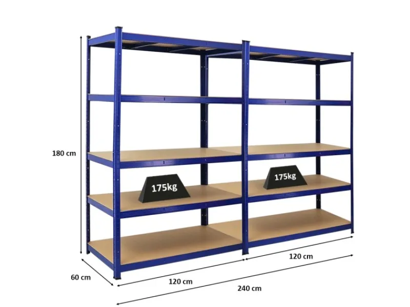 Jedes Regal hat 5 MDF-Holzplatten-Fachböden mit 2 Mittelträgern und trägt bis zu 175 kg pro Ebene