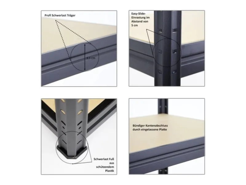 Jedes Regal verfügt über 4 Fachböden aus MDF-Holzplatten mit 2 Mittelträgern