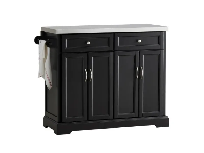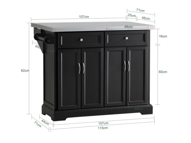 Ausgestattet mit einem Handtuchhalter, zwei geschlossenen Schubladen und zwei Geschirrschränken mit Türen, in denen Sie viele Utensilien verstauen können.