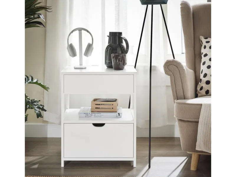 Ausgestattet mit zwei Schubladen und einem offenen Fach bietet die obere Schublade versteckten Stauraum, ideal für die Aufbewahrung persönlicher Gegenstände; Das offene Fach in der Mitte ist perfekt für Bücher, Telefone oder kleine dekorative Gegenstände.