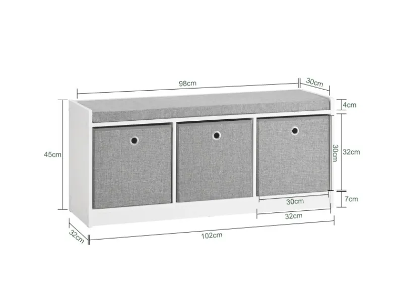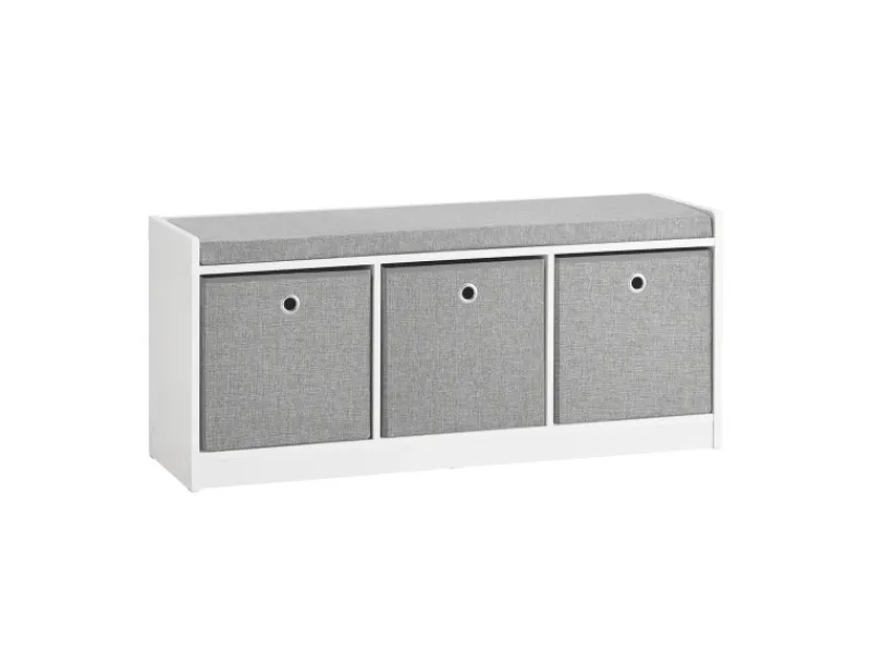 Sie verfügt über drei Körbe für Schuhe und Spielzeug.