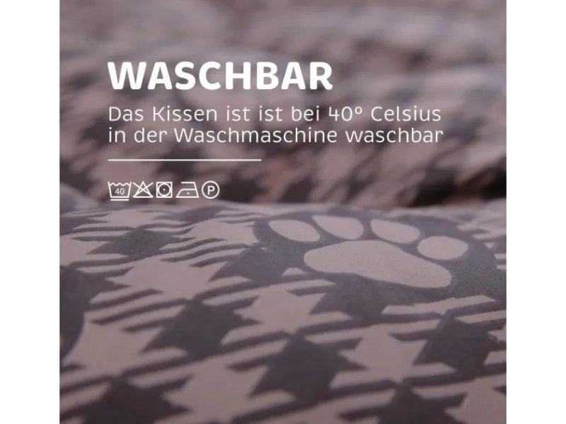 Das Haustierbett im zeitlosen Design auf neutraler Grundfarbe, ist Maschinenwaschbar bei 40°C und trocknergeeignet.