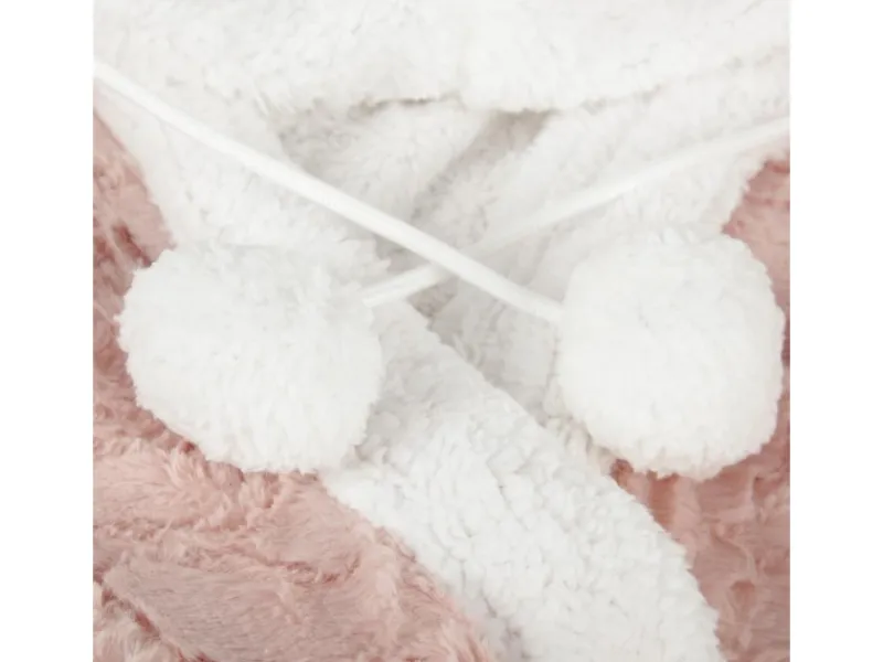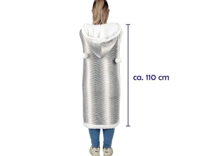 Bei den Maßen 130 x 180 cm ist die Decke groß genug für den ganzen Körper und die Kapuze kann an der durchgezogenen Kordel mit lustigen Flauschbommeln an den Enden für jede Kopfgröße passend gezogen werden.
