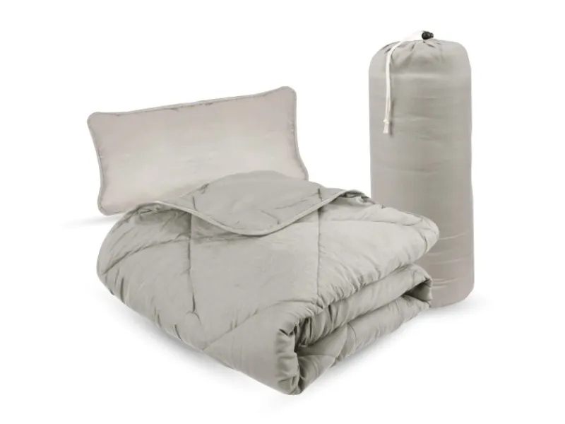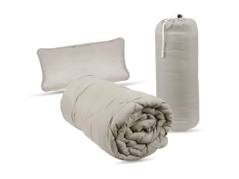 Inklusive einer 135x200cm Steppdecke und einem 40x80cm Kissen für unterwegs