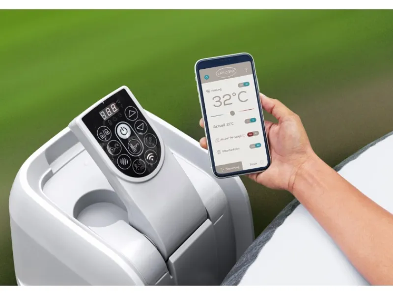 Das hochklappbare Bedienfeld lässt sich bequem per App steuern, sodass du alle Funktionen des Whirlpools auch von deinem Smartphone aus bedienen kannst. Der Energiespartimer ermöglicht die Heizplanung bis zu 40 Tage im Voraus und die Abschaltautomatik sorgt für zusätzliche Sicherheit. In der Pumpeneinheit sind praktische Getränkehalter und Ablageflächen integriert. Ergonomische Liegen und eine Sitzbank mit integrierten Düsen HydroJet sowie ein großer und kleiner Ring aus Düsen AirJet bieten höchsten Komfort.