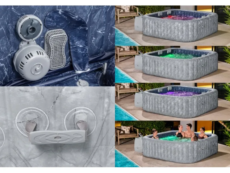 Der Bestway Whirlpool San Francisco HydroJet Pro wird mit einer 2 teiligen isolierenden Thermo-Abdeckung, einem Chemikaliendosierer ChemConnect, einer Filterkartusche Gr. VI, zwei wasserbetriebenen 7 farbigen LED-Leuchten ColorJet und fünf gepolsterten Schaumkissen geliefert.