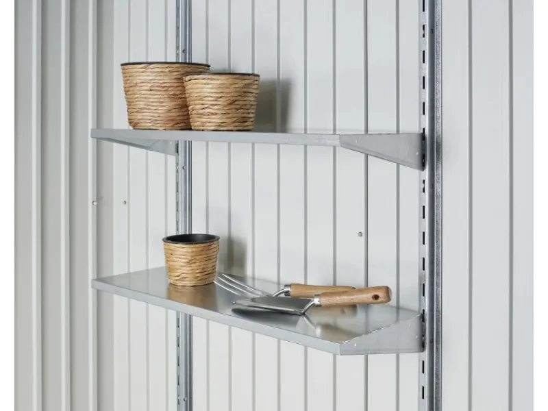 In der komfortablen Grundausstattung sind bereits zwei Regalböden mit entsprechenden Wandschienen enthalten. Hier können Sie beispielsweise Pflanzerde, Töpfe oder kleine Handwerkzeuge ablegen. Vier zusätzliche Gerätehalter dienen zum geordneten Aufhängen von Rechen, Spaten oder Schläuchen. Für die Innenseite der Türen sind zudem zwei Werkzeughalter enthalten.