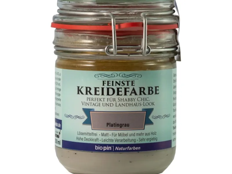 Die Biopin Kreidefarbe in Platingrau ist lösemittelfrei und besitzt eine hohe Deckkraft. Mit der Kreidefarbe können Sie Ihrer Kreativität freien Lauf lassen und Ihre Möbel in schönen Farben streichen. Auch den angesagten Shabby-Chic-Stil können Sie mit den matten Farben erhalten.