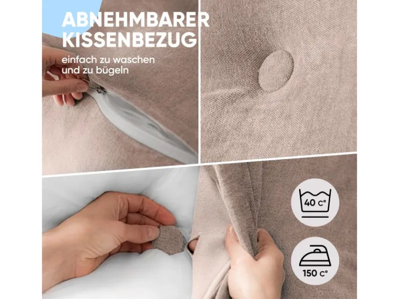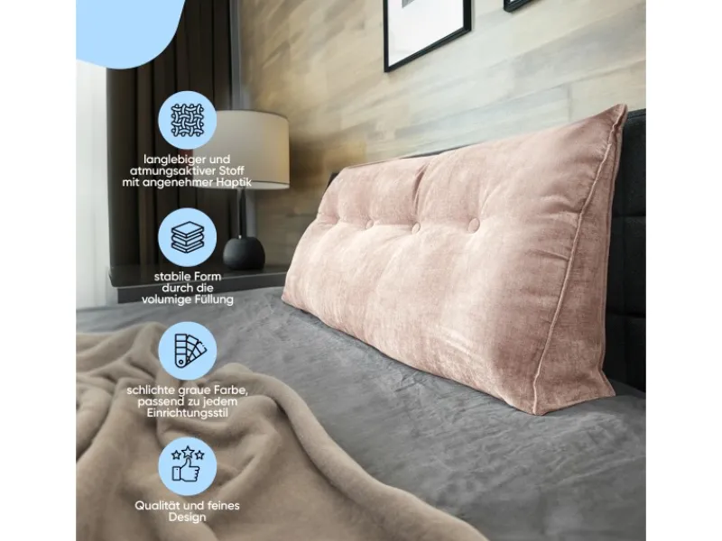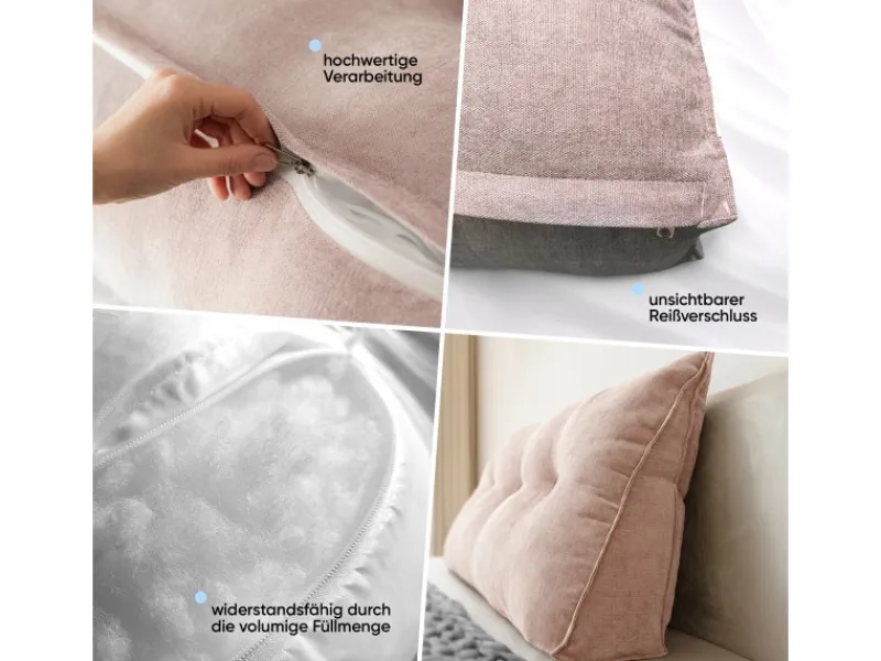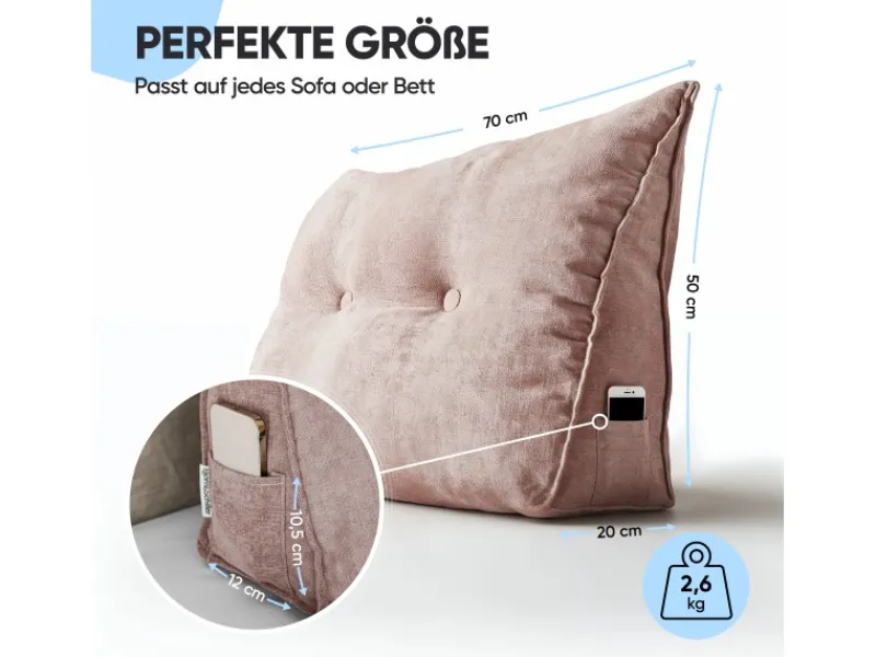 Je nach Ausführung hat das Kissen eine Länge von 70 Zentimeter, 100 Zentimeter, 120 Zentimeter, 140 Zentimeter oder 200 Zentimeter. Die Höhe beträgt jeweils 50 Zentimeter und die Breite 20 Zentimeter. Eine integrierte Seitentasche bietet Platz für kleine Gegenstände wie Fernbedienungen oder Smartphones. Der abnehmbare Bezug ist mit einem verdeckten Reißverschluss ausgestattet und lässt sich leicht reinigen.