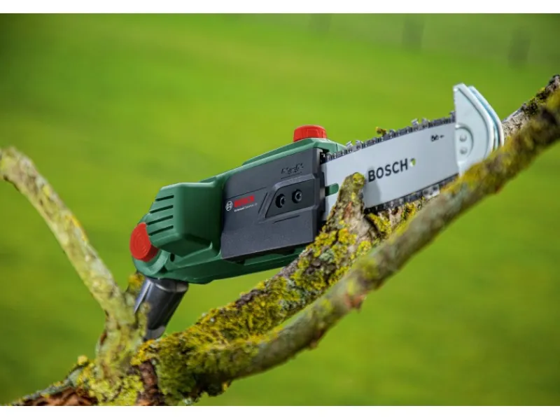 Der Bosch Akku Teleskop-Kettensäge UniversalChainPole 18 schneidet Äste mit seiner schnellen Kettensäge und lässt sich mit seinem 18-V-Akku kabellos im Garten einsetzen. Durch Verlängern des Teleskopstiels und der praktischen Neigefunktion des Kopfteils, kanns du Äste sägen, die du sonst nur schwer erreichen würdest.