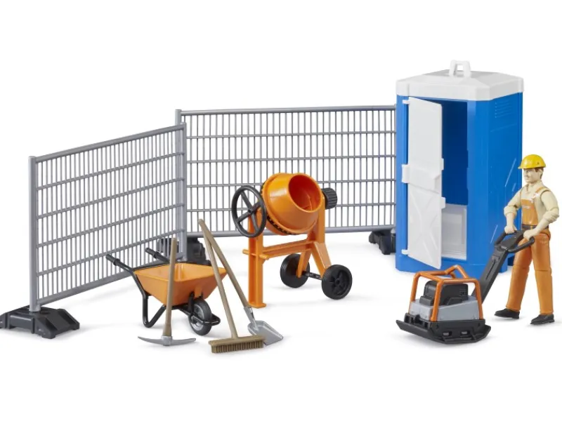 Spielzeug Baustellenset bestehend aus einer Bauarbeiter-Figur, Rüttelplatte und Mörtel-Mischmaschine, Bauzäune, Baustellen-WC und Baustellen-Zubehör
