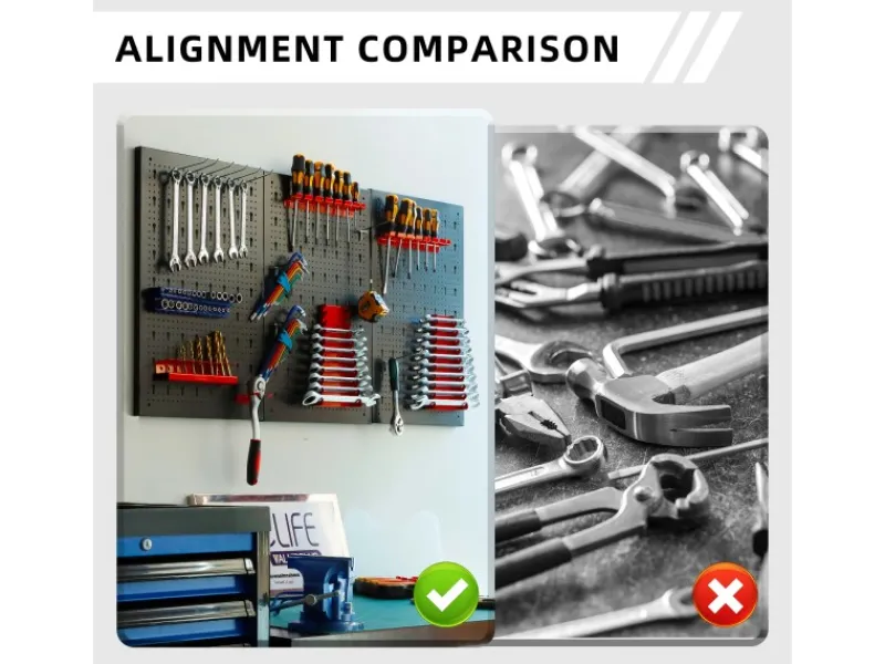 Unsere Metallwerkzeugwand besteht aus drei durchstoßbaren Wänden, die Sie individuell oder zusammen je nach verfügbarem Platz kombinieren können.