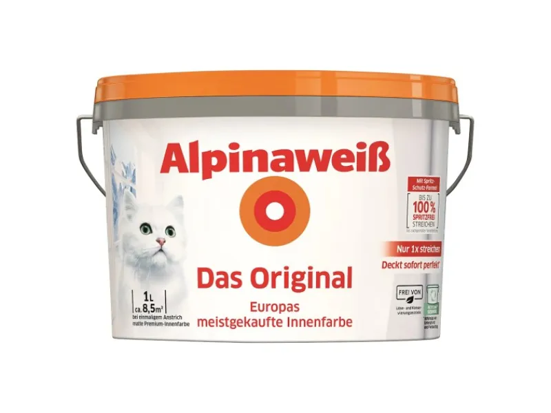Holen Sie sich jetzt das spritzfreie Alpinaweiß Das Original in Ihr Zuhause. Das Spitzenprodukt aus dem Hause Alpina deckt sofort perfekt und ermöglicht bei sachgemäßer Verarbeitung bis zu 100% spritzfreies Streichen. Alpinaweiß ist noch ergiebiger und kann mit handelsüblichen Rollern ganz leicht verarbeitet werden. Es empfiehlt sich jedoch die Verwendung des Alpina Spritz-Schutz-Spezialrollers, weil dadurch das Risiko von Spritzern und Tropfen bei der Verarbeitung minimiert werden kann.
