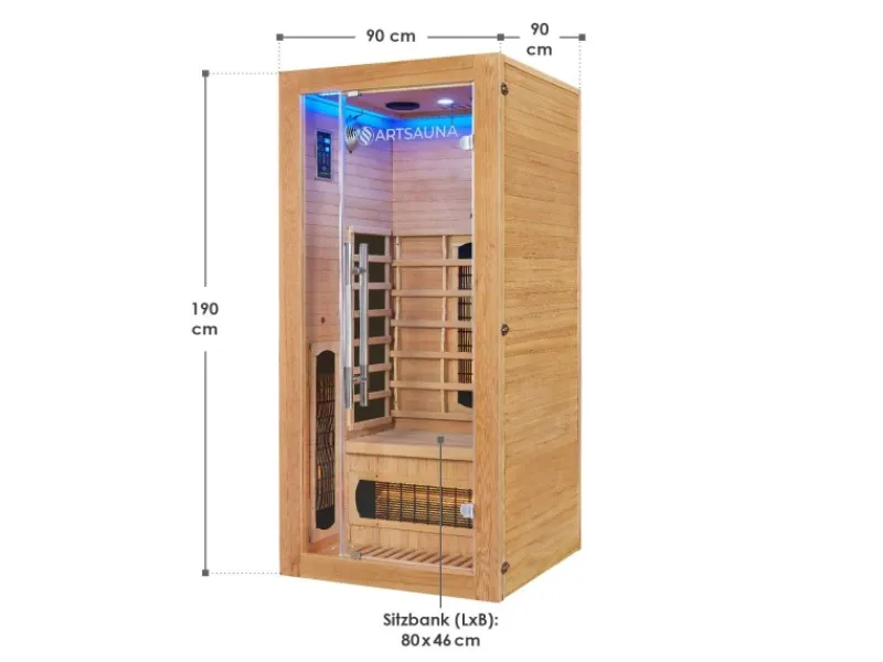 Die geräumige Holzbank bietet einer Person einen komfortablen Platz. Mit nur 90 x 90 cm Stellmaß eignet sich die Kabine perfekt für kleine Räume.