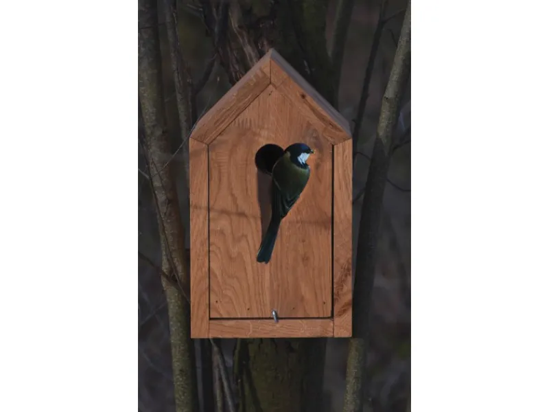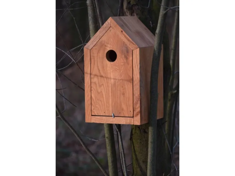 Der Design-Nistkasten mit Spitzdach in modernem Look ist aus imprägniertem, massivem EU-Eichenholz gefertigt. Der Innen-Korpus ist komplett herausziehbar und ermöglicht somit eine einfache und praktische Reinigung. Das Einflugloch beträgt Ø 32 mm. Das gebohrte Loch an der Rückwand ermöglicht ein einfaches Befestigen an Bäumen oder Wänden.