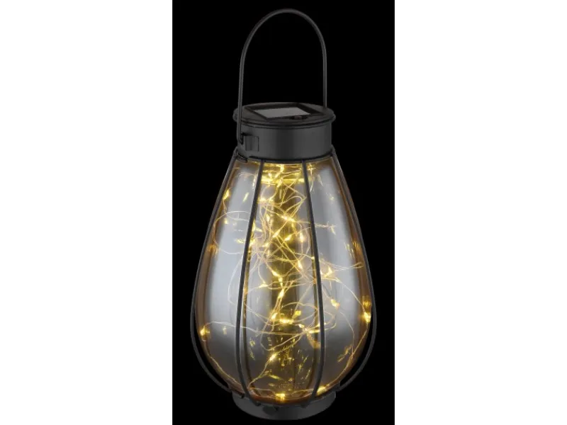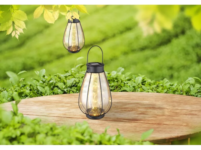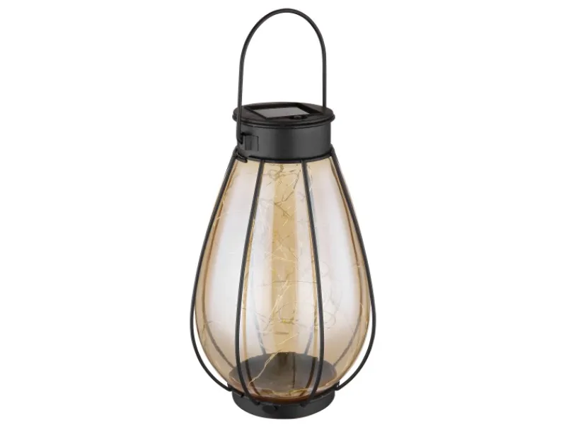 Die Globo Solarleuchte begeistert durch ein tolles Design. In Form einer Laterne besitzt die Leuchte aus schwarzen Metall ein amberfärbiges Glas und eine integrierte Lichterkette. Zudem besitzt diese Leuchte über einen IP44 Schutzgrad, welcher die Leuchte gegen Spritzwasser schützt.