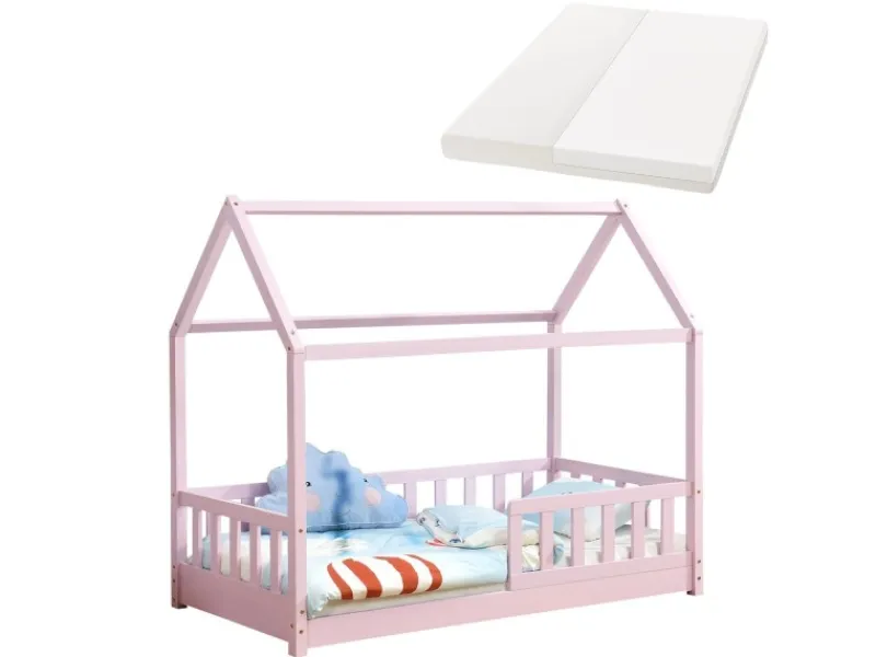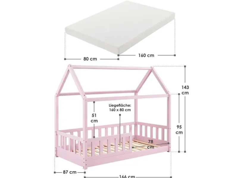 Kinderhausbett für kleine und große Abenteurer Das moderne Kinderbett Marli (80×160 cm, Rosa ) mit Rausfallschutz, Matratze, Lattenrost und Dach ist ideal für Mädchen und Jungen von 3 bis 10 Jahren. Als gemütlicher Schlafplatz und Spielort verschönert das Hausbett jedes Kinderzimmer. Denn die Hausoptik mit offenem Dach bietet viele Möglichkeiten! Gestalten Sie das Bett mit Himmeldekoration, als Höhle oder ein abenteuerliches Spielbett. Besonders für junge Kinder bietet ein Gitter mehr Schutz und Sicherheit. Für einen langjährigen Einsatz ist das Holzbett durch das massive und pflegeleichte Kiefernholz die richtige Wahl. Produktmerkmale Bett mit Matratze:
