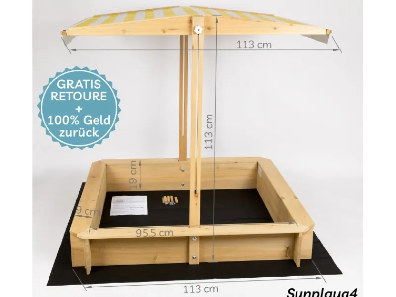 needs&wants good things Vorname: „Sunplaya4“ Artikelmaße: 113 x 113 x 113 cm (Breite x Tiefe x Höhe), Innenmaße: 95,5 x 95,5 x 19 cm (B x T x H) = ca. 150-170 Liter bzw. 175-225 kg zum Befüllen mit Sand Artikelgewicht: 9,65 kg Material: hellbraun vorlasiertes Tannenholz (Cunninghamia lanceolata), Farbe auf Wasserbasis, wasserdichte Polyester-Dachfolie mit silberner UV-Schutz-Innenfolie, Abdeckung OXFORD 600D Polyester-Gewebe wasserdicht Lieferumfang: Sandkasten-Bausatz mit zusätzlicher Abdeckung inkl. Aufbauanleitung u. Nutzungshinweisen