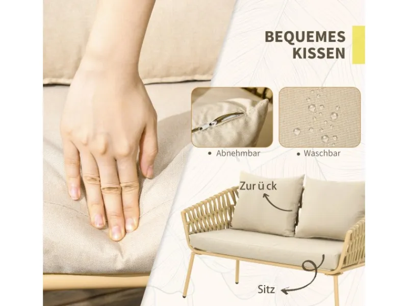 Verschönern Sie Ihren Garten und machen Sie den Außenbereich Ihres Hauses genauso einladend wie den Innenbereich. Dieses Gartenmöbel-Set von Outsunny besteht aus einem stabilen Rahmen und dekorativ geflochtenem, hochwertigen Kunstratten. Traumhaft bequeme, tiefe Sitze und weiche Sitzkissen machen sich hervorragend im Garten, auf der Terrasse oder am Pool. Dekorativ und funktional, schafft diese Sitzgruppe eine einladende Umgebung, die Sie und Ihre Familie das ganze Jahr über nutzen werden.