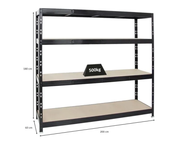 Das Schwerlastregal ist 180 cm hoch, 200 cm breit und 60 cm tief. Die Farbe ist Schwarz